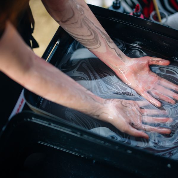 Chaque personne choisit ses couleurs et l’artiste peint sur l’eau un design qui lui sera unique. Il suffit de tremper l’avant-bras pour que le motif s’imprime comme par magie.